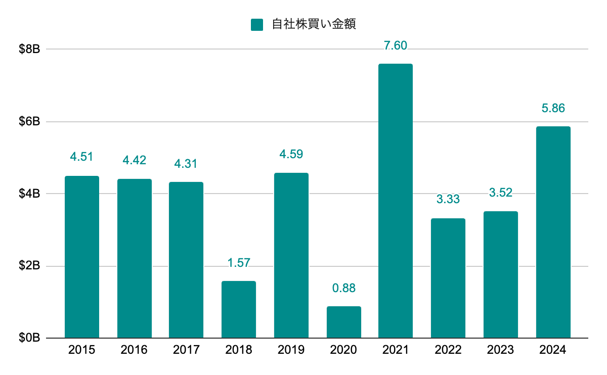 継続的に高水準の自社株買いを実施。パンデミック時の2020年は控えめだったが、増配を停止した2021年は自社株買いを倍増。