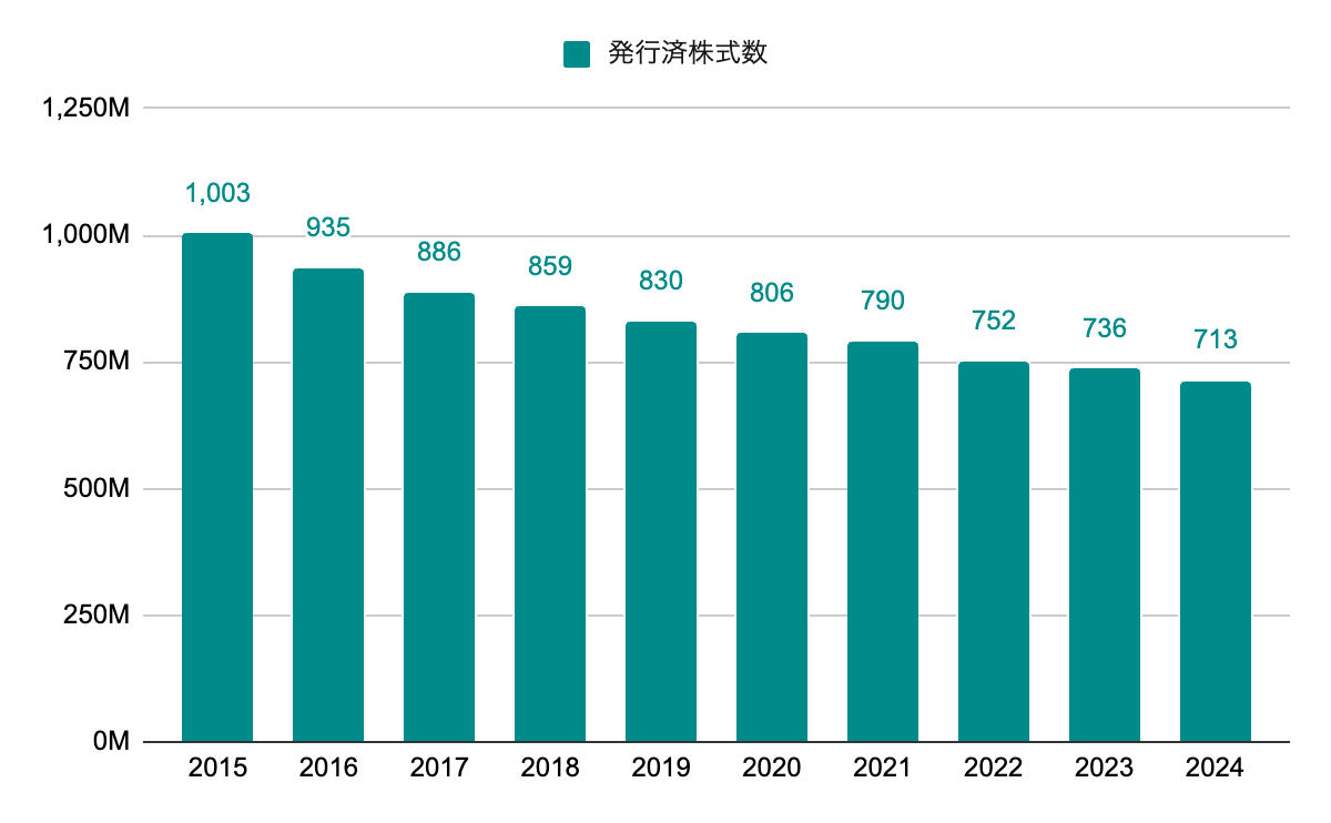 継続した自社株買いにより減少を続ける。10年で3割程度の減少とEPSへの貢献が大きい。