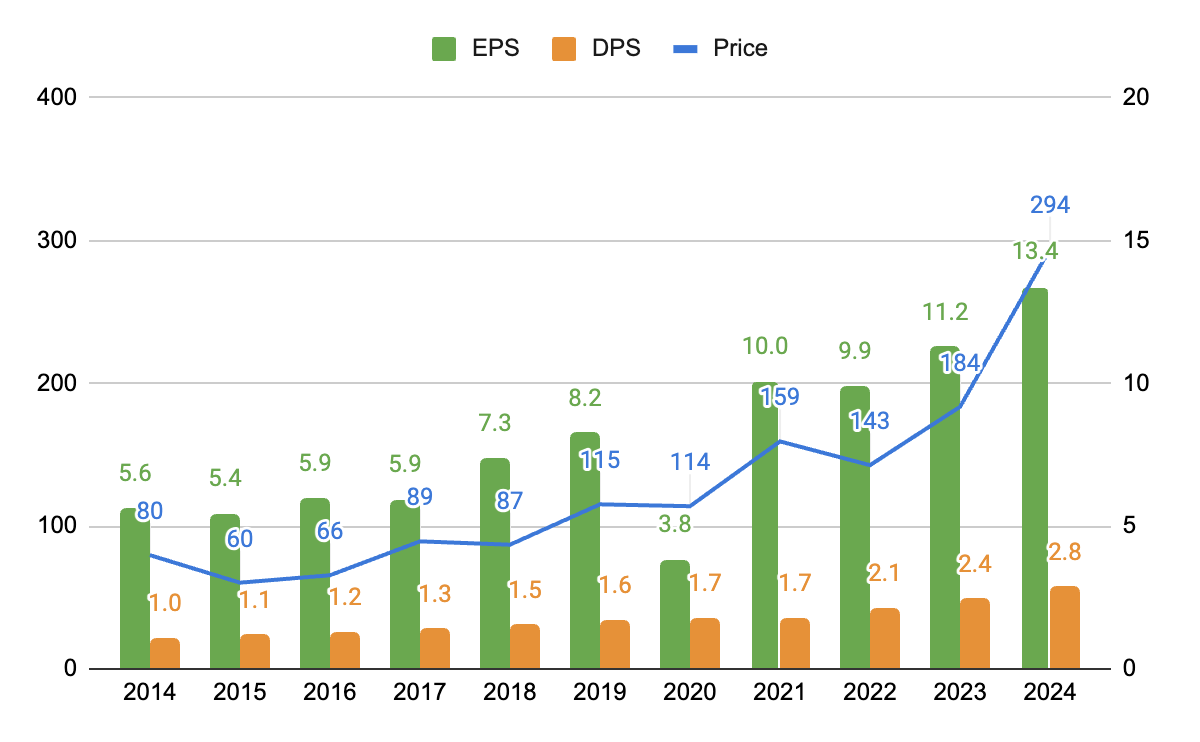 上のグラフは、年次のEPS、DPS、株価の推移を纏めたものです。長期的にはEPS成長と共に株価も上昇、配当も連続増配は2021年で止まったものの減配はしておらず、優良な銘柄だと思います。バフェットの銘柄選択術的には一時的な要因でEPSが落ち込んだ2020年の株価が下がったタイミングが買い時だったと言えそうです。