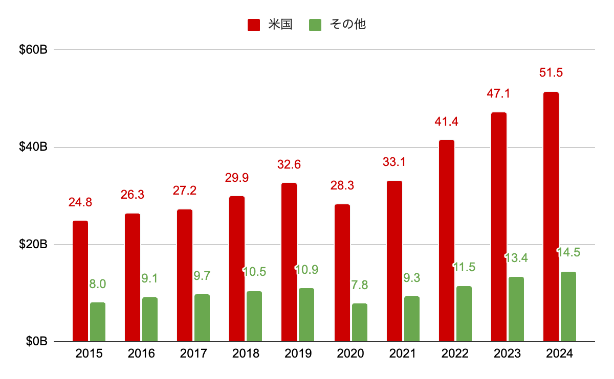 世界中で展開しているが、売上の8割弱は米国。ここ10年は米国の占める割合はあまり変わっていない。