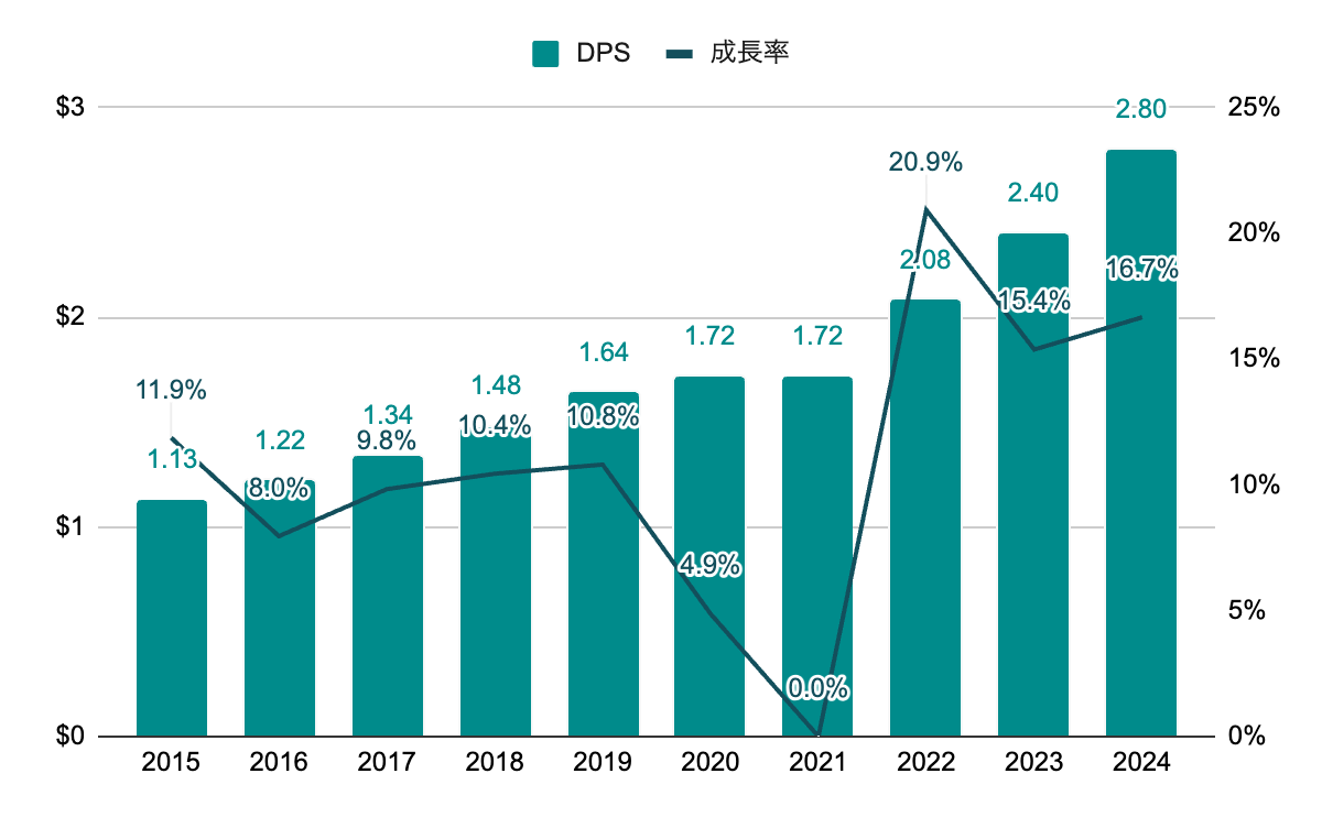 10%前後の増配を継続していたが、パンデミック後の2021年に連続増配がストップ。2022年からは以前より高水準で増配を再開。