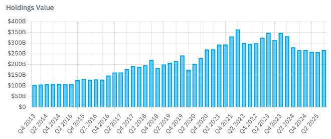 時価総額は減少傾向が続いていましたが、2025Q3は上昇となりました。とはいえ、株価の上昇に伴い時価総額が増えただけで、バークシャーが買い出動した結果ではありません。現金及び短期国債の比率は高いままなので、株式に慎重な姿勢は変わらずかと思います。