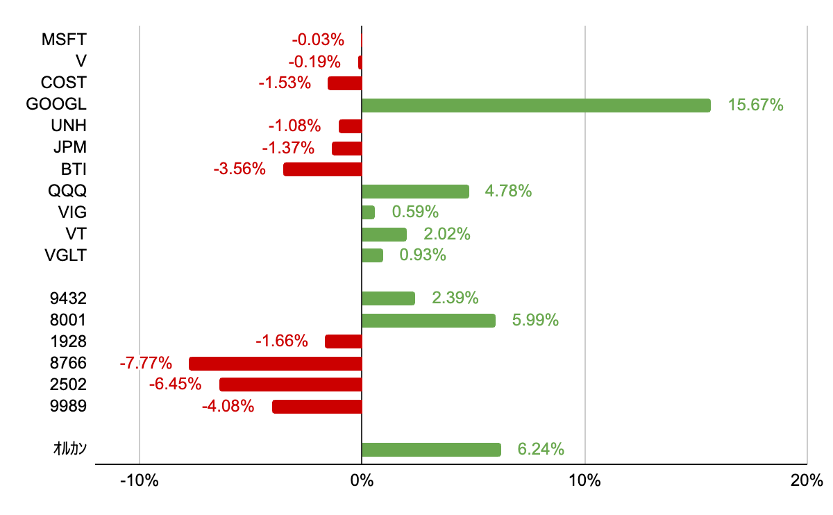 アルファベット<GOOGL>が3ヶ月連続で10%以上の上昇と絶好調です。明らかに割安となっていたので、これでも割高感はなく、ようやく適正くらいになったかなという印象です。その他の個別銘柄はイマイチでしたが、アルファベットのおかげで米国株全体としては良い結果となりました。