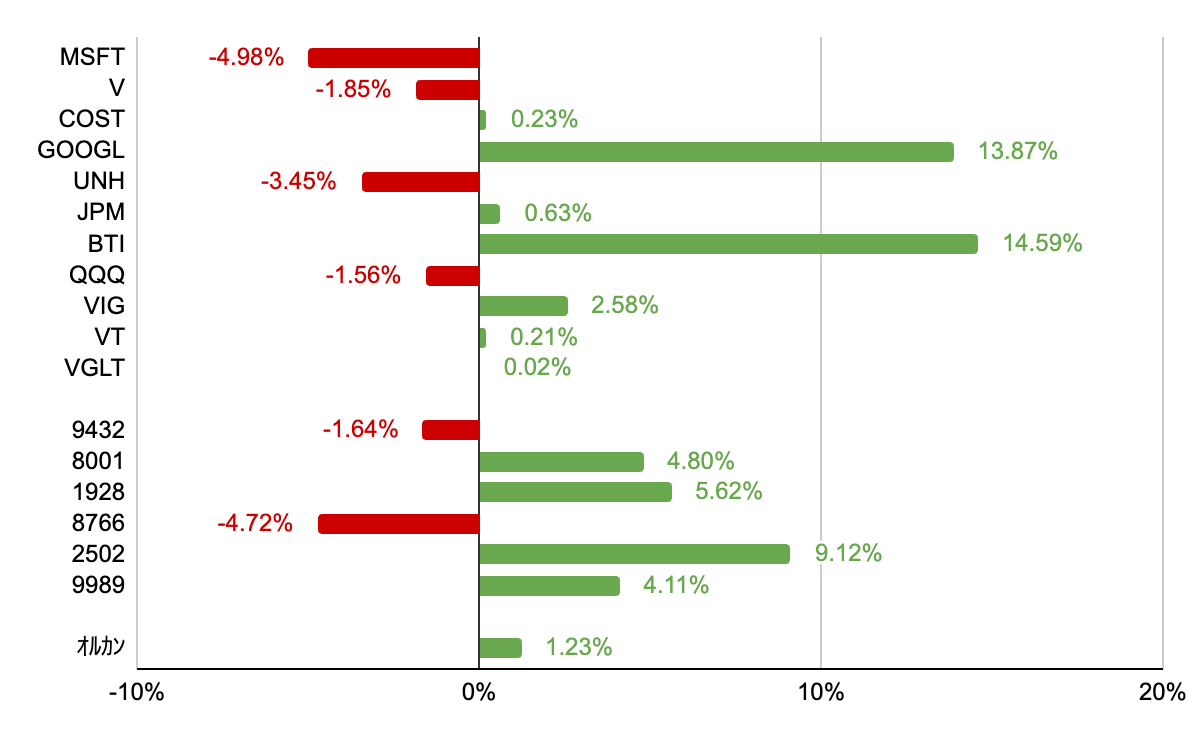 アルファベット<GOOGL>がまさかの4ヶ月連続で10%以上の上昇となりました。これまでは割安だと記載してきましたが、ここまで上昇してくるともう割安感はなく、これ以上上昇すると今度は割高に感じられそうです。ブリティッシュ・アメリカン・タバコ<BTI>も好調が続いていて、ついに取得金額から2倍の評価額となりました。