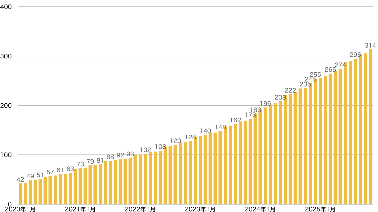11月は8万円超とぼちぼちの金額となりました。以下のグラフは2020年以降の累積配当金の推移です。