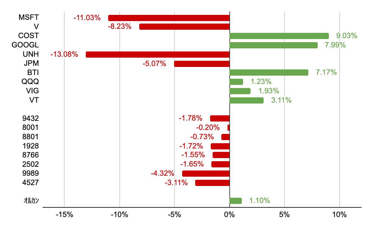 TOPIXが好調な中、保有8銘柄全てがマイナス。日本株比率はまだ低く下落幅も大きくはないので、全体への影響はそこまでないものの、過去にないくらい酷い結果になりました。日本株は波に乗れない状況が続いています。