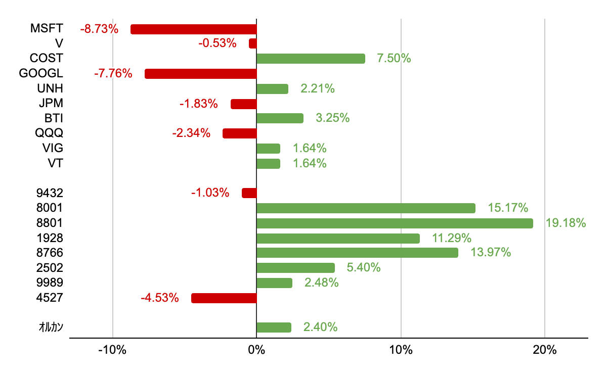10%超の上昇が4銘柄と私のポートフォリオもだいぶ自民党圧勝の恩恵を受けました。昨年末に新規購入した住友不動産が20%近い上昇となったのは嬉しいところです。日本株の中では比率が高めの、伊藤忠商事、積水ハウス、東京海上HDも10%超の上昇となり、ポートフォリオ全体を押し上げてくれました。