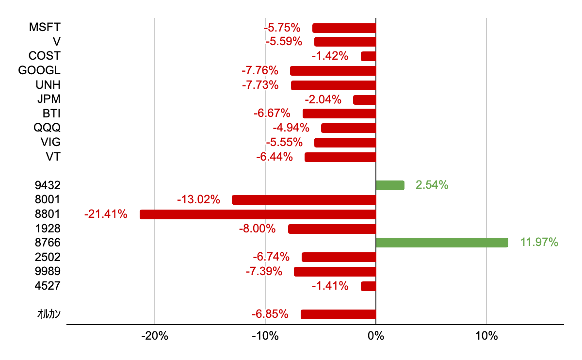 全てマイナスは月毎に纏めるようになってから初ですね。10%を超えるような大幅なマイナスがないのは幸いでした。保有比率が1番大きなコストコが1%ちょっとの下落で済んだこともあり、米国株の全体のパフォーマンスはS&P 500とほぼ同じくらいとなりました。