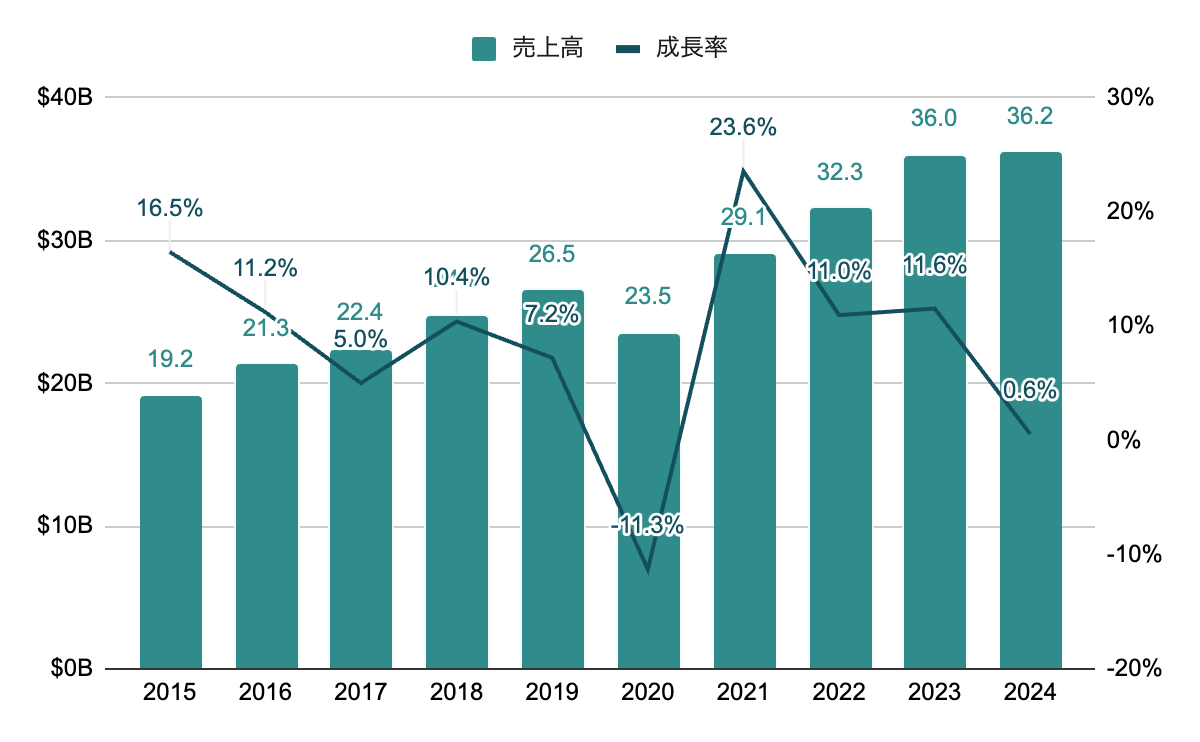 2019年までは安定した高成長。2020年のパンデミック時に大きく減少。2021年には回復したものの、近年は安定した成長とはなっていない。