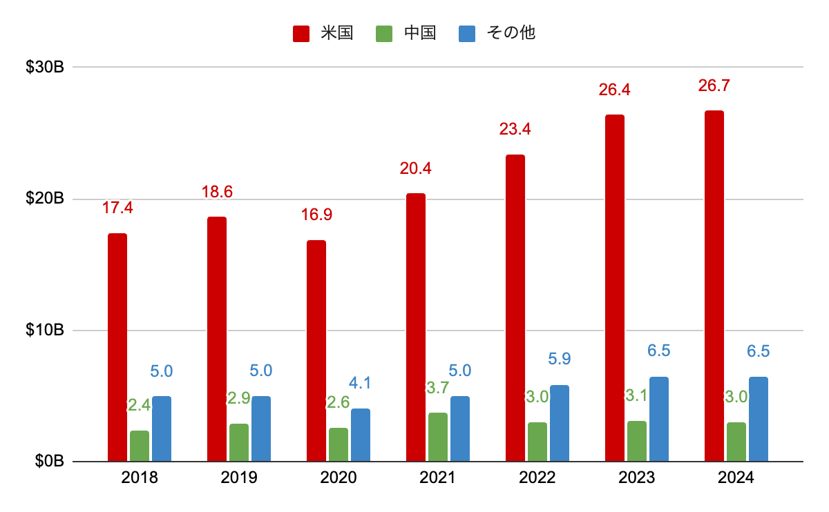 中国が個別に切り出された2018年以降を掲載。世界中で展開しているが、売上の7割超は米国。現在は1割を超えている国は他になく、成長が期待されていた中国も売上は横ばい。