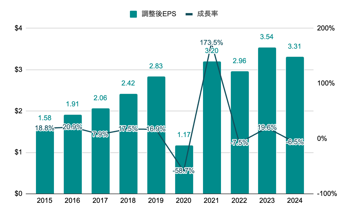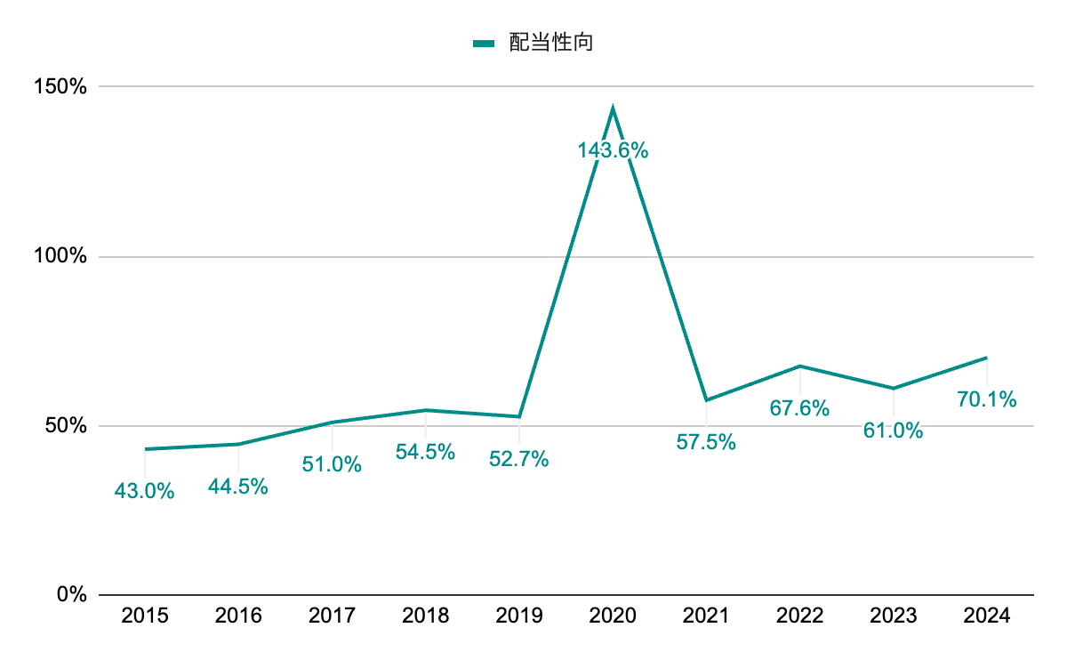 EPS成長が安定しない中、増配を継続しているため配当性向は増加傾向。2020年はパンデミックで大きく純利益が減少したが、増配を継続したため、配当性向が100%を超える結果に。