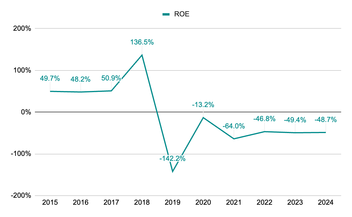 2017年までは50%前後で推移。2019年以降はROEがマイナスとなっているが、これは自己資本がマイナス(債務超過状態)となっているため。2018年と2019年に純利益を大きく超える巨額の自社株買いを実施し、それ以降は債務超過状態で経営を続けている。