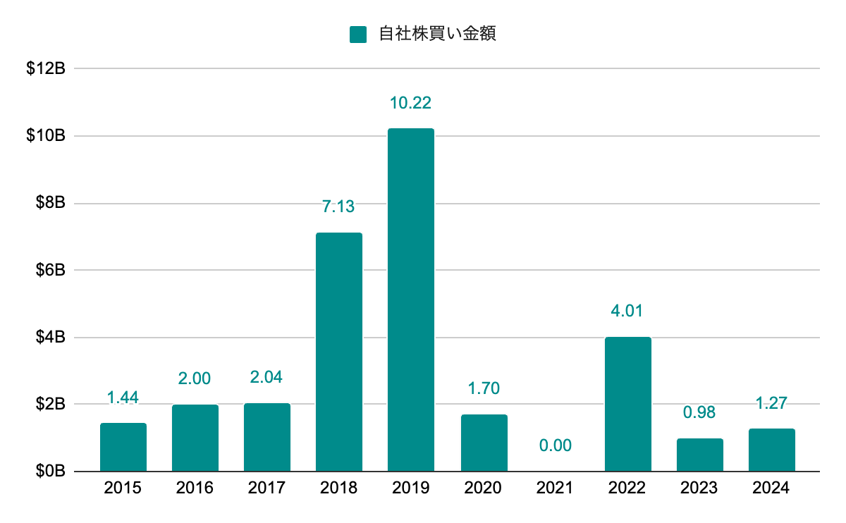 2018年と2019年に巨額の自社株買いを実施。2021年を除き、継続的に実施している。