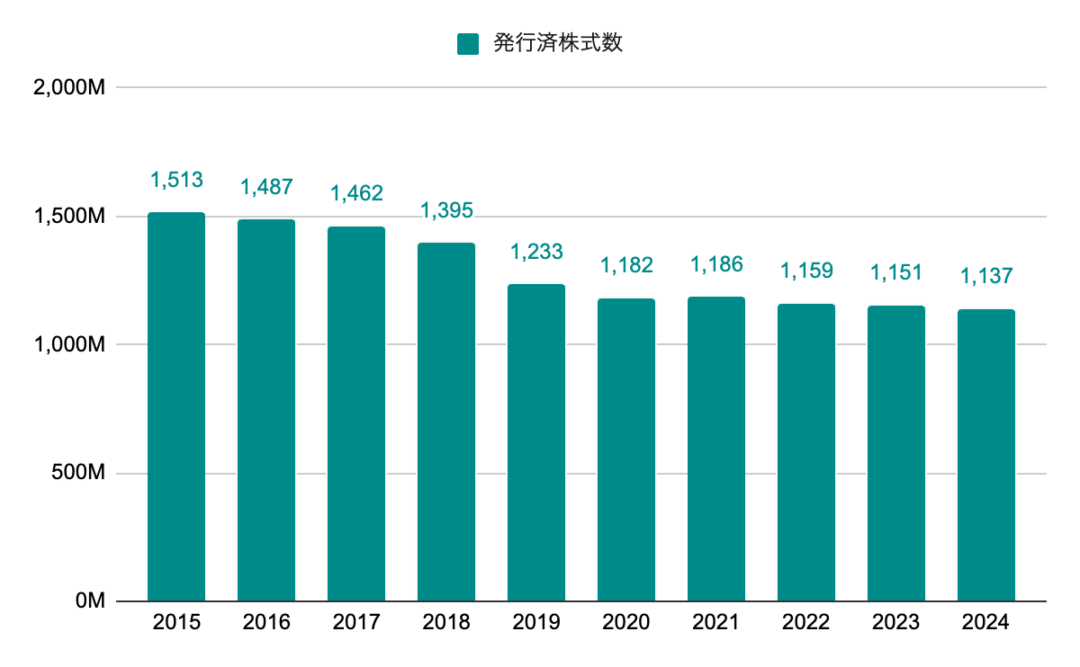 自社株買いにより減少を続ける。2018年と2019年は大きく減少。
