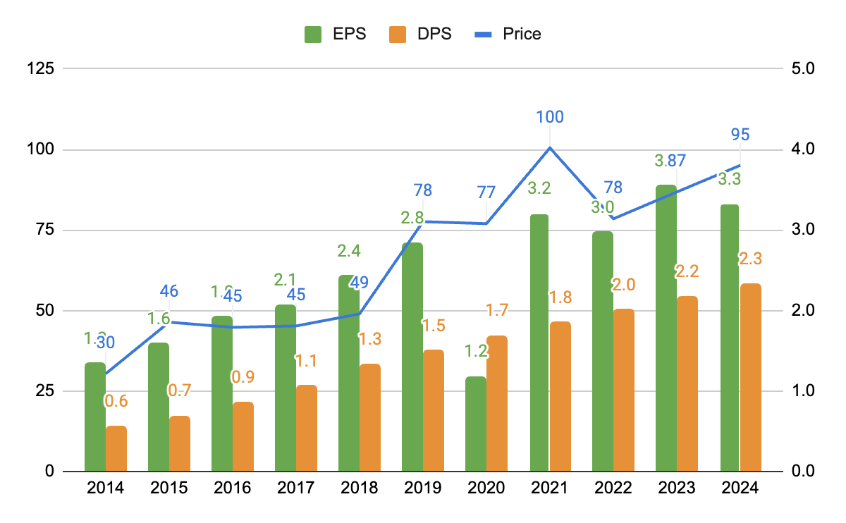 上のグラフは、年次のEPS、DPS、株価の推移を纏めたものです。長期的にはEPS成長と共に株価も上昇、配当も安定の連続増配と悪くはないように見えます。ただ現在は上述したように問題も多い状況です。2014年に完全子会社化されたスターバックスコーヒージャパンがまだ独立して上場していれば、そちらの方が良い投資先だったかもしれません。
